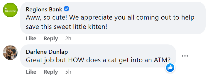 Comments on the post indicate that the kitten was at an ATM at Regions Bank, but everyone seems to be in the dark as to HOW the kitten got inside.