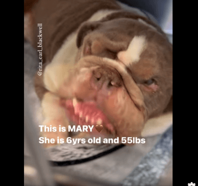 Mary is thought to be only six-years-old and weighs 55 pounds. Sadly, this is what overbreeding and neglect does to dogs – even sweet ones like Mary, who has been quiet and calm in her kennel. Immediately after her video, she hopped right back into her kennel