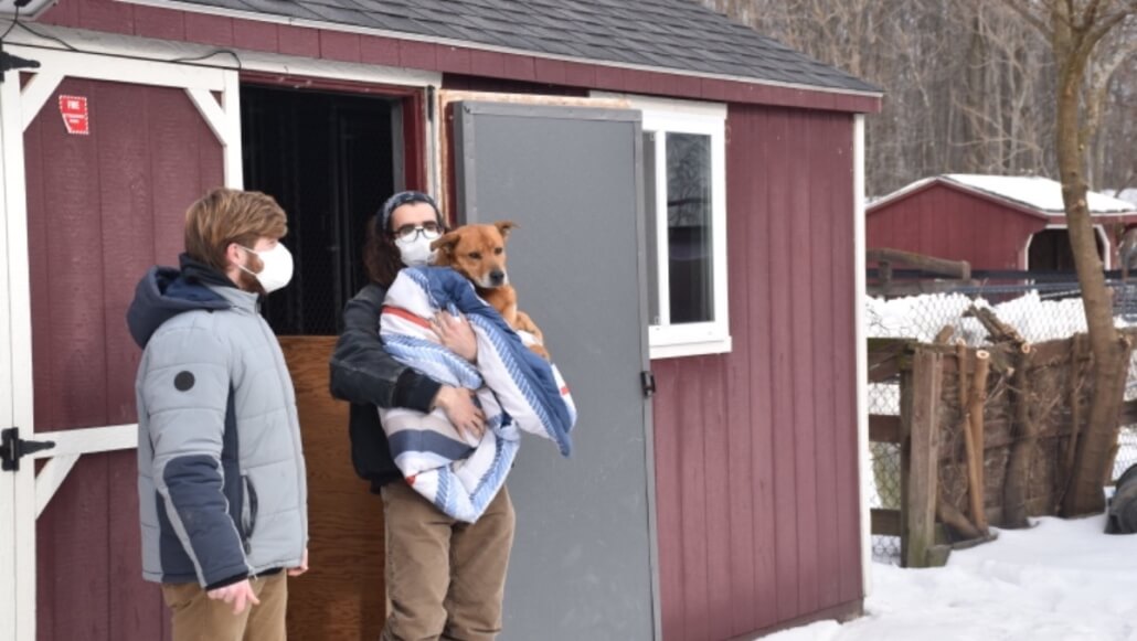 State troopers had also spotted the dog, but attempts at capturing him were to no avail. And on Friday, he was found hiding in a barn on a nearby farm. The pup had no intentions of letting anyone get near him, but that all changed when rescuers reached out with a rotisserie chicken placed in a humane trap.