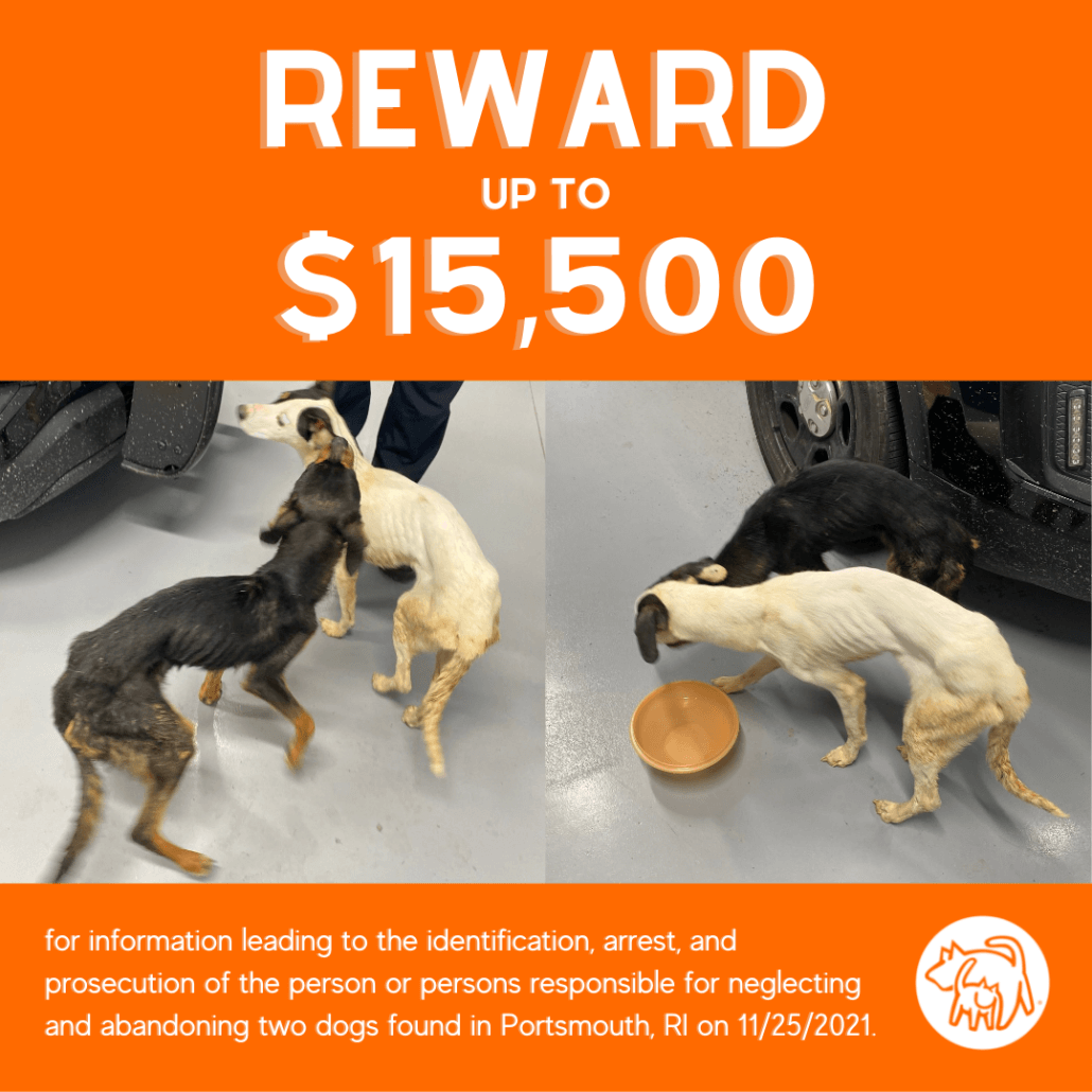 Anyone who has any information about two abandoned, lethargic and emaciated dogs found lying on the side of the road in the Gardner Seveney Sports complex in Portsmouth, Rhode Island on Thanksgiving day is being asked to contact the Portsmouth Police Department. The reward has been increased to $15,500 for information leading to the identification, arrest and prosecution of the person(s) responsible for the animal cruelty.