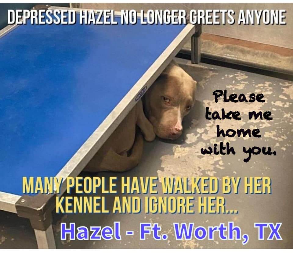 More than 55 days have passed since Hazel was brought to Fort Worth Animal Care & Control. Hazel wasn’t always this depressed, but watching the other dogs gleefully leaving their shelter cages – wagging their tails and greeting their new families, has undoubtedly weighed heavily on this sweet girl.