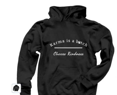 Karma is a b*tch. Choose kindness! Our unique design spreads an important message! Choose your favorite color and style at this link. Your purchase helps support the continuation of our site. Thank you!
