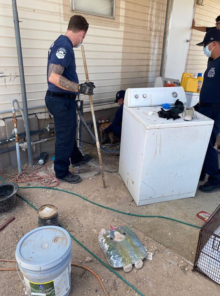 “Rural Metro Firefighters were called out to assist Pima Animal Care Center with a young pup unable to free his head from a block wall. Cinder is free from the wall and doing much better now! Great job to Captain Pittenger and crew.”