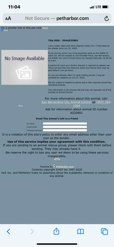 I am a male, black and white Siberian Husky mix. I have been at the shelter since Jun 22, 2020. If you are my owner, you must physically come to the shelter to claim me. We are located at 333 Chandler Place, San Bernardino, CA 92408. Our Lost & Found hours are Tuesday-Saturday 10:00 am to 5 pm.