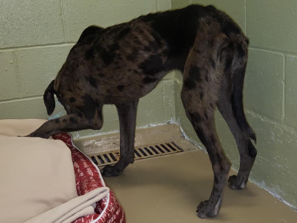 The emaciated dog was wrapped in blankets and sent for veterinarian care. He was able to drink and eat on his own, and it is expected the one-and-a-half-year old male will make a full recovery. He did present with bacterial infections which are now being treated.
