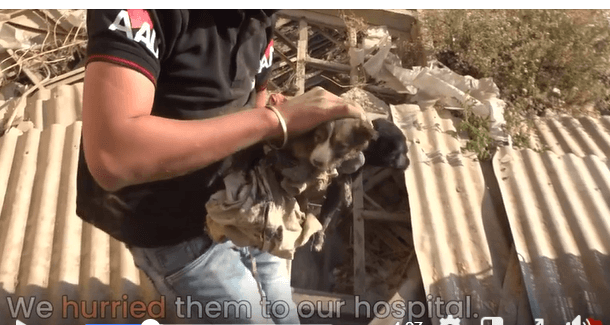 In the area of Udaipur, Rajasthan, three puppies became encased in hardened road tar. When rescuers from Animal Aid Unlimited arrived, one of the puppies had already died from the toxic material; now to figure out how to rescue the other tiny victims. Two of the three puppies had somehow made it back to their mother with tar covered over half of their bodies.