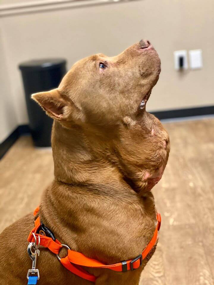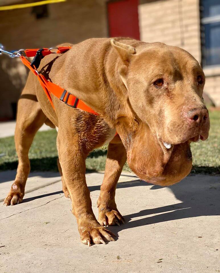 On the dog’s arrival at San Tan Animal Hospital, veterinarians examined the mass on his neck – the size of a small watermelon. It was so heavy, the weight of the tumor pulled down Zeus’ ear. When he walks, it bumps on curbs, and he is unable to even sniff without dragging the mass.