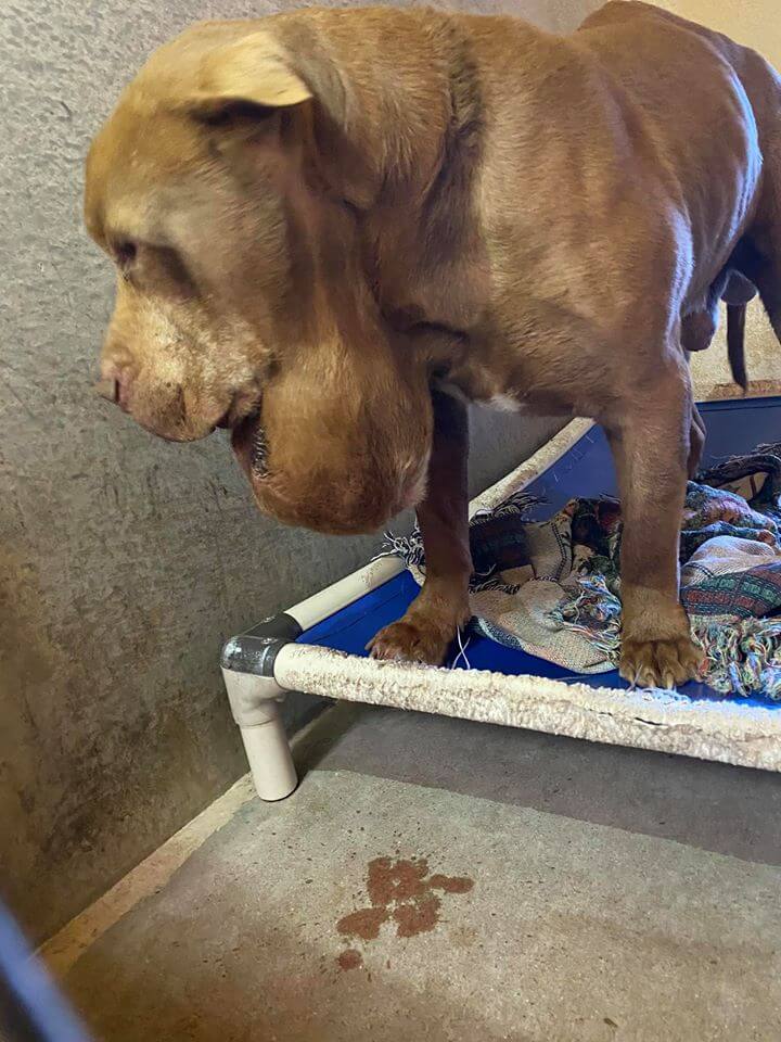 In the area of Casa Grande, Arizona, a bystander spotted a U-Haul truck pull over who pushed Zeus out. They told the dog to sit and stay. Then the heartless people got back in the truck and drove off; Zeus ran his fastest to follow his “owners.” And for days, Zeus waited at the shelter for help – his infected tumor draining on the shelter cage’s floor.