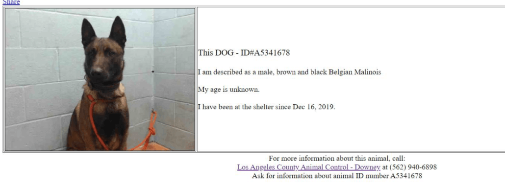 Please share his plight. If anyone knows his owner or is interested in adopting him when the waiting period is over, please contact the shelter. Share with approved rescue organizations, friends, family and social media contacts. Shelters are overcrowded and tragically even the healthiest, nicest dogs are at risk of losing their lives.