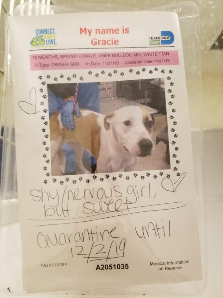 Gracie just doesn’t seem to have much luck, and she’s barely 10-months of age. On Thursday, Gracie was surrendered to the Miami-Dade Animal Services because she bit her owner on the finger when the puppy began to fight with the family cat over food.