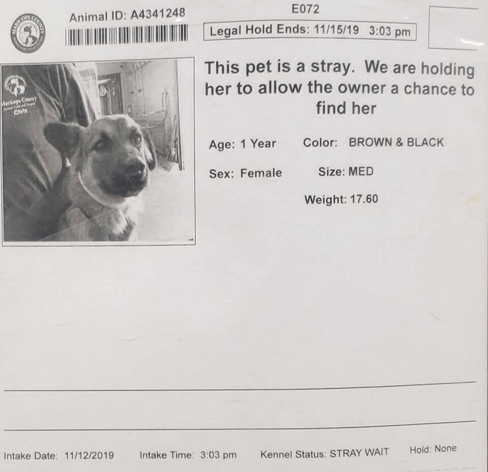 “… listed by the shelter as an only 1 year old German shepherd mix, not yet spayed, microchipped, or wearing a collar at intake. She is about 17 lb & a bit shy so far in the loud shelter, but seemed appreciative to have some yummy snacks.”