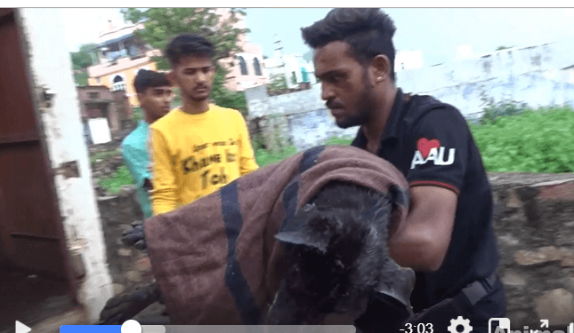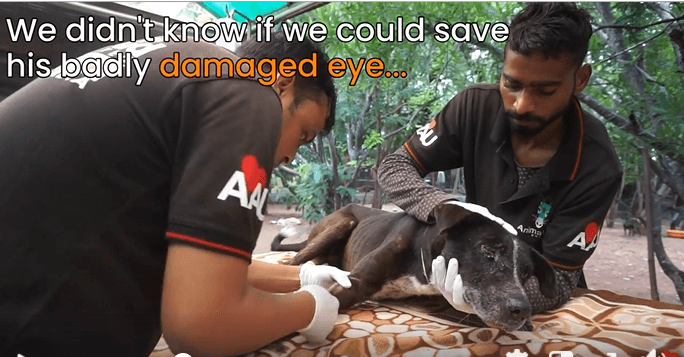 Animal Aid Unlimited was called to help, and as the emergency ambulance volunteer arrived, he saw how seriously injured the dog was, as well as being completely disoriented.