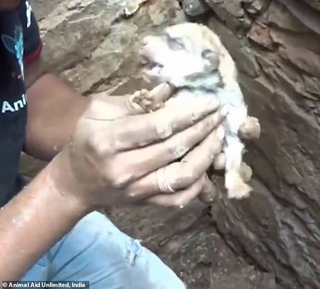 The man is soon able to pull out another puppy estimated to be no more than a few weeks of age.