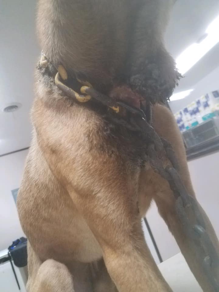 According to the True Citizen, the Sheriff’s Office responded to an alarm report at the 400 block of MLK Road in Keysville. When they arrived, there was no evidence of any forced entry. As the officers tried to make contact with the owner, they spotted a small brown dog chained to a tree by a tangled iron link chain. The dog was not able to reach either food or water. In addition, the chain was so embedded, the dog was unable to bark and his neck was severely infected.