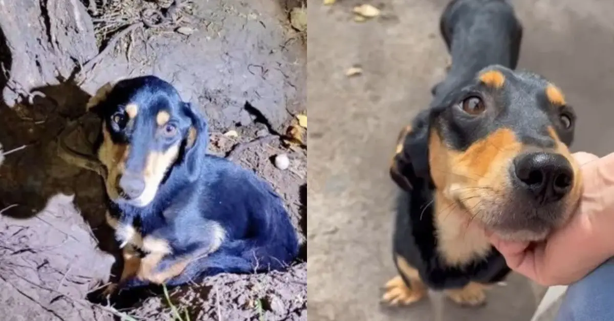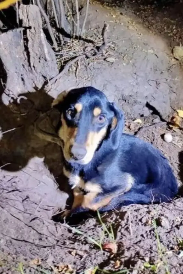 Weakened by hunger and thirst, Bumbi was barely able to bark for help. Desperate and alone, he dug a hole in the ground and curled up, resigned to his fate.