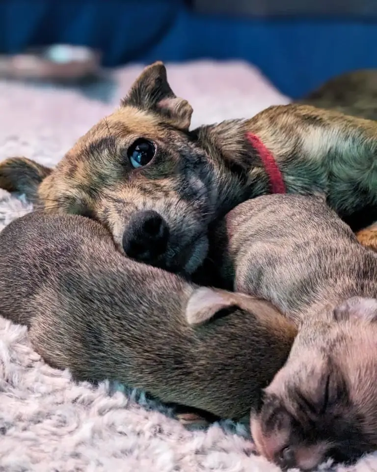 The puppies’ unique black and yellow fur revealed a surprising truth: their father was Bagel, a dog who had arrived at the shelter with Pita. Despite being separated during Pita’s pregnancy, Bagel was also rescued and placed in a foster home.