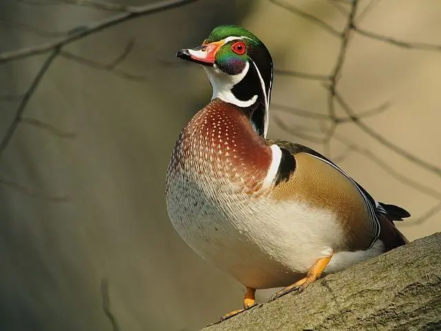 The wood duck or Carolina duck is a species of perching duck found in North America. Alon with the Mandarin duck is known to be one of the most beautiful waterfowl in the world. Males wear a purple to green head, and crest with a white belly and red chest. Layered around the neck are delicate white stripes. The wings are blue and black. Female ducks are as colorful as their male counterparts.