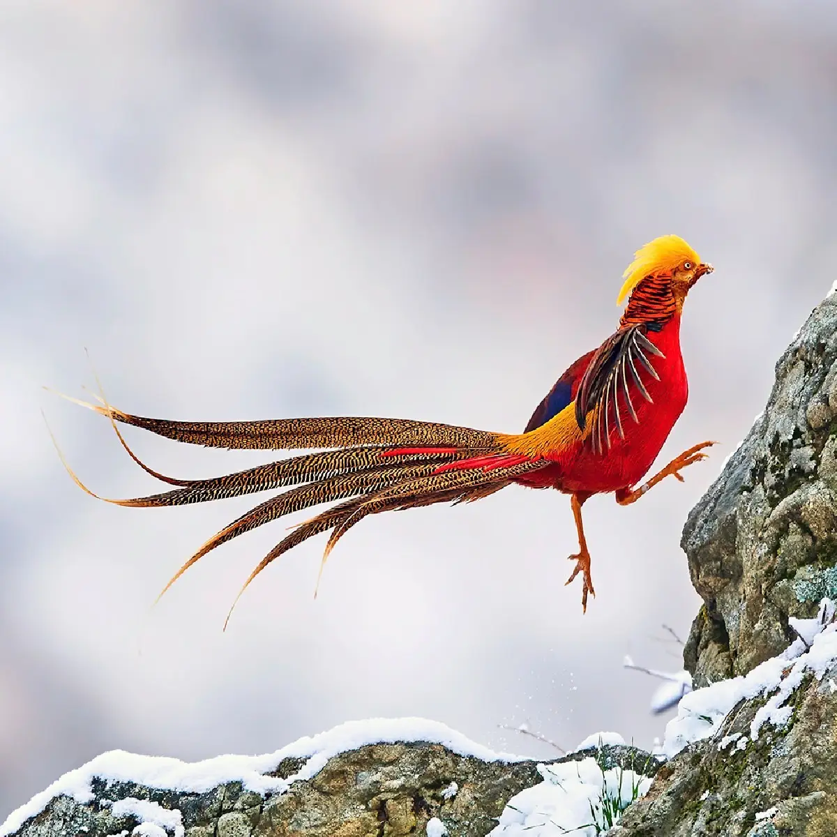 Golden pheasants are renowned around the world for their brilliantly colored golden-yellow plumage. Their underparts are similarly brilliantly colored in bright red, their sides and throat a rusty tan. Males are far more colorful than females being a duller mottled brown plumage.