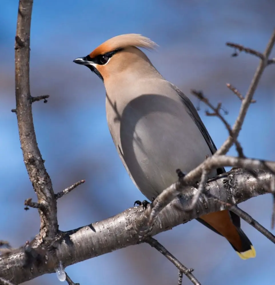 The Bohemian waxwing is a highly distinctive medium-sized songbird with a sweptback crest and black mask. An overall grey-to-brown bird with white-to-yellow edging on the wing makes this a highly attractive bird. Bohemian waxwings inhabit boreal forests across North America and Eurasia. Both male and female birds dine on insects and berries and are well known for their high-pitched calls.