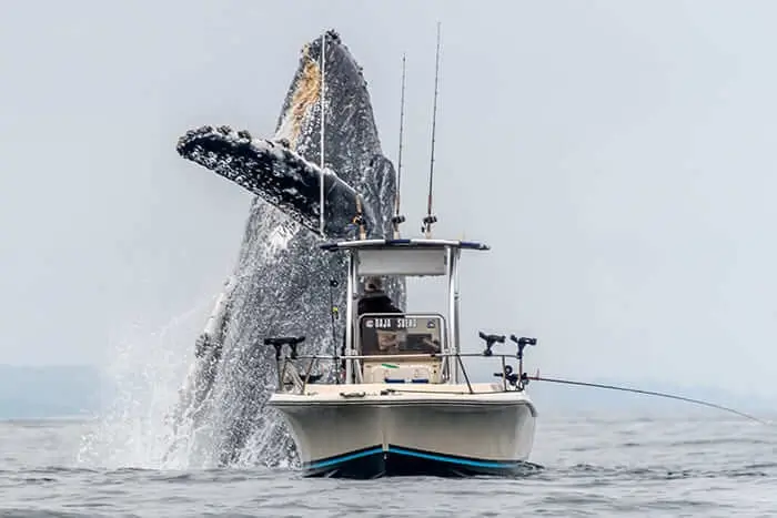 The photographer managed to capture the perfect angle, capturing the whale’s immense size and power. The image showcases the whale’s majestic form as it soars above the water, dwarfing the fishing boat below.