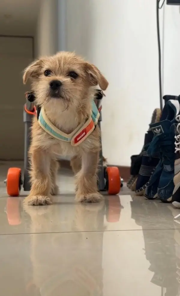 To aid Peluchin in regaining mobility, Grandez’s boyfriend, Sebastian, built him a wheelchair. This innovative solution proved incredibly effective, providing Peluchin with the support he needed to exercise his hind legs and regain strength and flexibility. With the help of the wheelchair, Peluchin’s energy levels increased, and he became more motivated to walk again. Grandez, unable to keep pets herself, focused on finding Peluchin a loving forever home. After his stitches were removed, she successfully found a perfect family for him. Although it was difficult to say goodbye, Grandez knew she had given him the best possible start to his new life. She continues to visit Peluchin in his new home, where he greets her with enthusiastic kisses, demonstrating the lasting impact of her compassion and care. While he still uses the wheelchair, everyone hopes that one day he will be able to run and play without it, fully embracing his second chance at life.