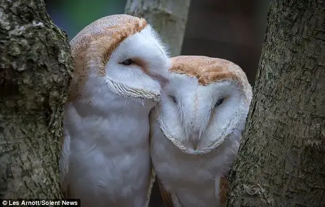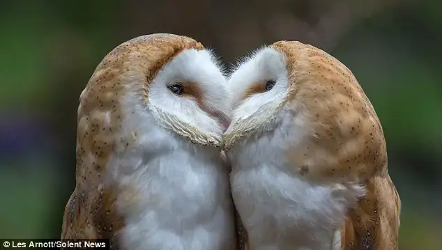 Leslie Arnott, a UK-based photographer, was in a small village in Staffordshire when she witnessed and photographed an extraordinary interaction between two barn owls. In the dim light of the woodland, she observed the pair engaging in what appeared to be a romantic encounter. Arnott described how the owls flew together for a while before landing on a tree branch and beginning to rub their heads against each other. This display of affection culminated in a moment that Arnott described as a “kiss,” a sight she had never witnessed before or since.
