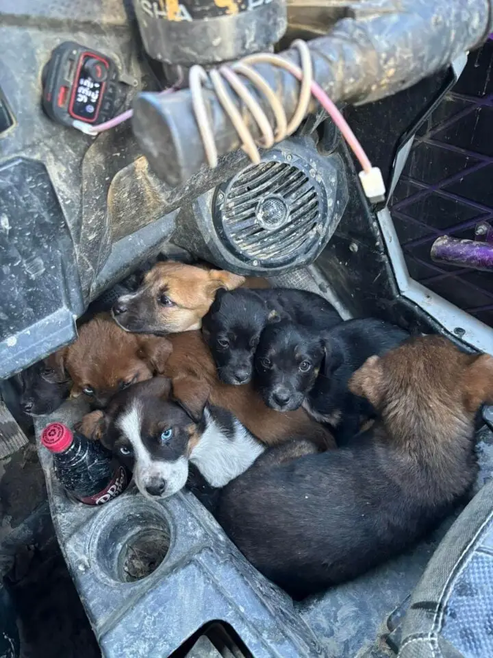 The kind-hearted people carefully picked up the puppies and placed them on the floor of their ATV, ensuring their safety and comfort.