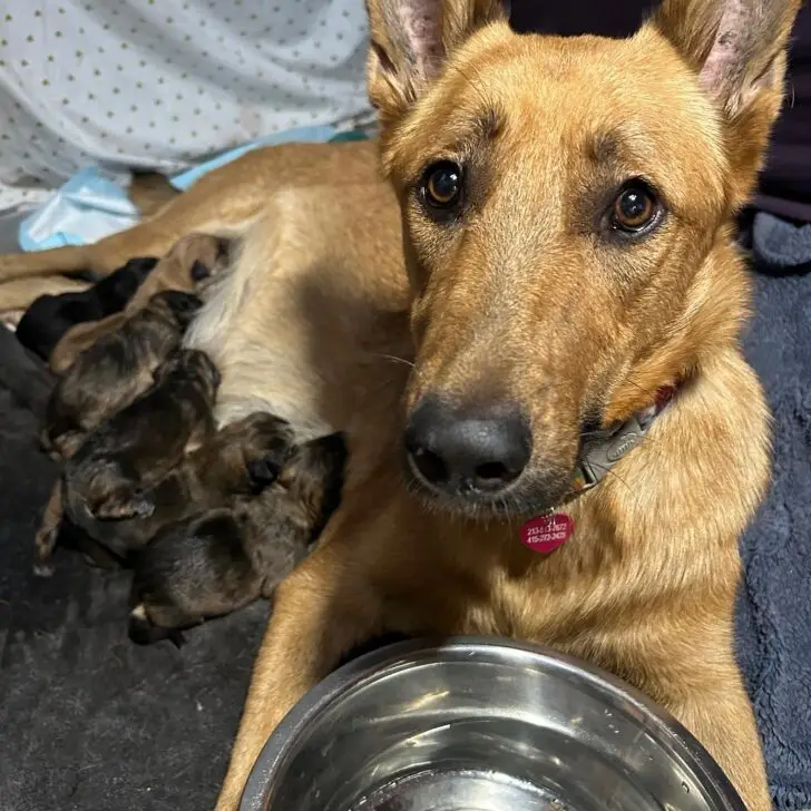 “We all decided that it was the best chance the puppies had. So, 11 o’clock at night when they arrived, I sped over as fast as I could, got them in a crate, picked them up, drove them home, opened the crate and she started sniffing them and wagging her tail and licking them and then trying to crawl into the crate,” Eve vividly recounted the pivotal moment of introduction.