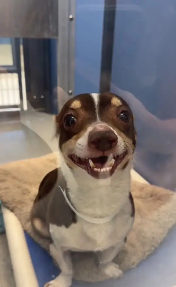 The moment the little pup saw his dad walk through the shelter doors, his entire demeanor transformed. His worried expression vanished, replaced by unadulterated joy. He began jumping and wriggling with unrestrained excitement, his tail wagging furiously. A wide, happy “smile” seemed to stretch across his face as he gazed up at his owner, his relief and happiness palpable.