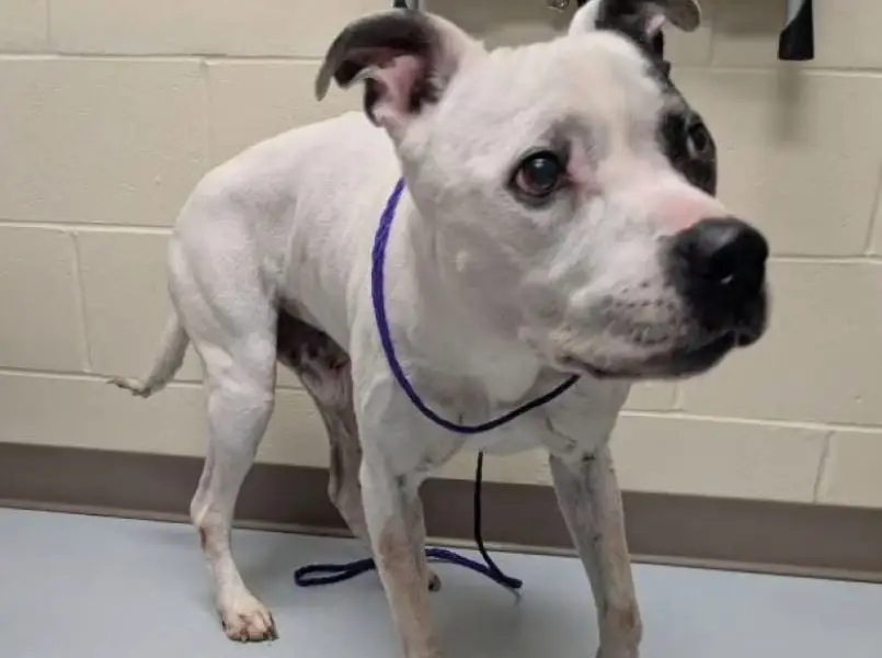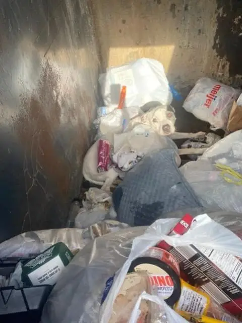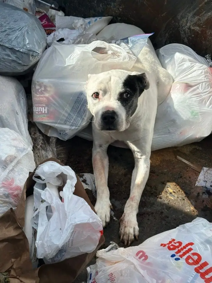 As she lifted the heavy lid of the dumpster, expecting to see nothing more than refuse, Gin Walker was met with a shock that pierced her to the core. From the dark depths of the container, a pair of the saddest eyes she had ever seen stared back at her, a silent and desperate plea for help emanating from the bottom of the trash-filled bin. Her heart sank with a heavy weight of sorrow and disbelief as she realized the extent of the creature’s plight. The desperate occupant of the dumpster was a white Pit Bull mix, distinguished by a striking black marking on his face, his gaze conveying a profound sense of fear and abandonment.