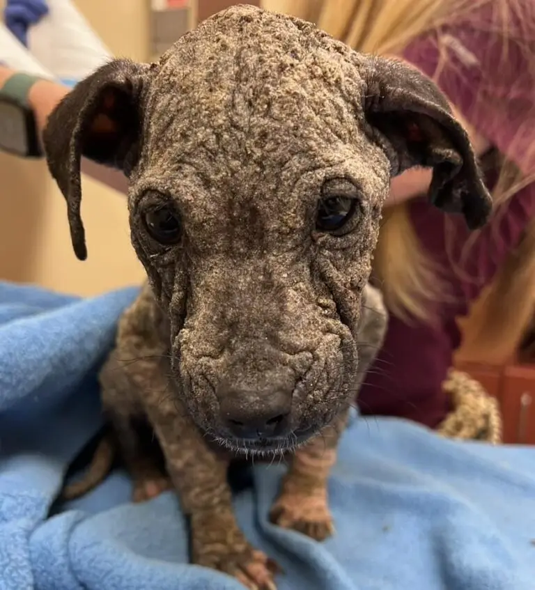 The kind-hearted couple brought their car to a screeching halt, their instincts urging them to investigate the source of the barely visible ears. They rushed towards the spot, their concern growing with each step. What they discovered was a sight that tugged at their deepest emotions: a small puppy, utterly motionless, lying defeated amongst the grass. He appeared to have already surrendered to his dire circumstances, his tiny body conveying a sense of utter hopelessness. His physical condition was shocking; completely hairless and covered in the telltale signs of severe mange, his emaciated frame looked as hard and lifeless as stone. It was clear that the puppy was in critical condition and desperately needed immediate medical intervention to have any chance of survival.