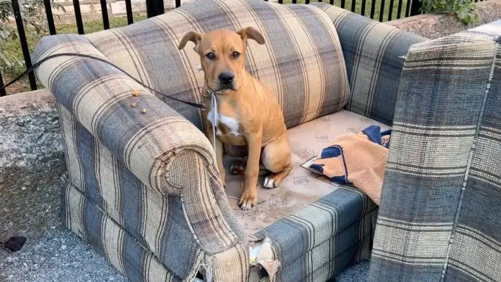 On an ordinary morning in Missouri, a woman named Emily was on her usual walk when something unusual caught her attention near a public dumpster. As she approached, she was stunned to find a small dog trembling with fear, tied to the dumpster and completely abandoned.