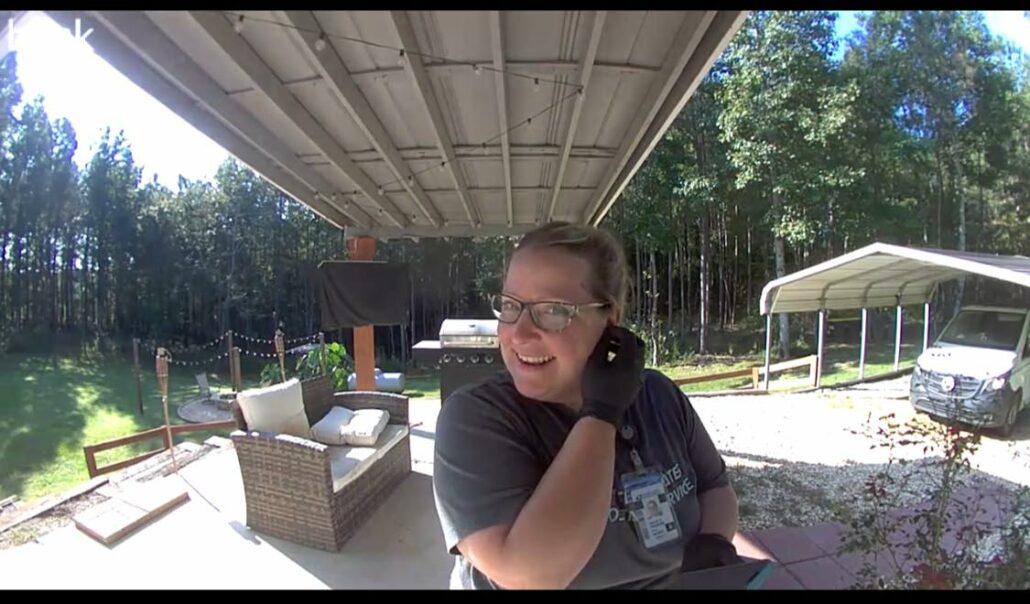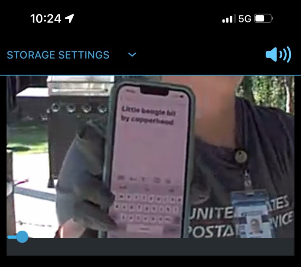 According to a Facebook post, by Kelsey Proctor, both she and her husband had been at work when their doorbell camera showed their postal worker holding up a note on her phone. The note stated that Ginger had been bitten by a copperhead and that she was bringing the dog to the vet.