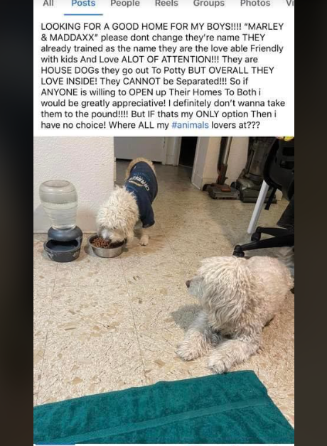 the owner posted asking peoples help in rehoming the two and she didn’t have any luck nor any rescue that offered help. She said the shelter refused to take the dogs, but she chose a place where she knows that people will see and noticed them…