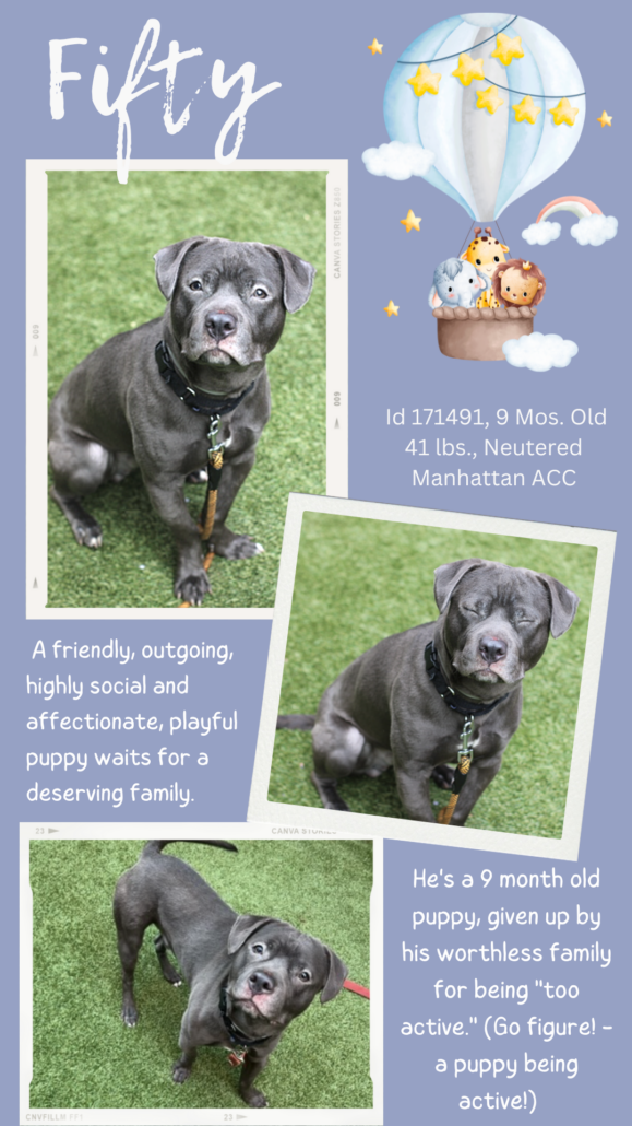 Meet a cute little nine-month-old bundle of energy and cuteness named Fifty. At Manhattan’s New York City Animal Care Centers, Fifty has been scheduled to die. His owners surrendered him to the shelter because he was “too active” and obviously never spent the time or taught him basic puppy manners.