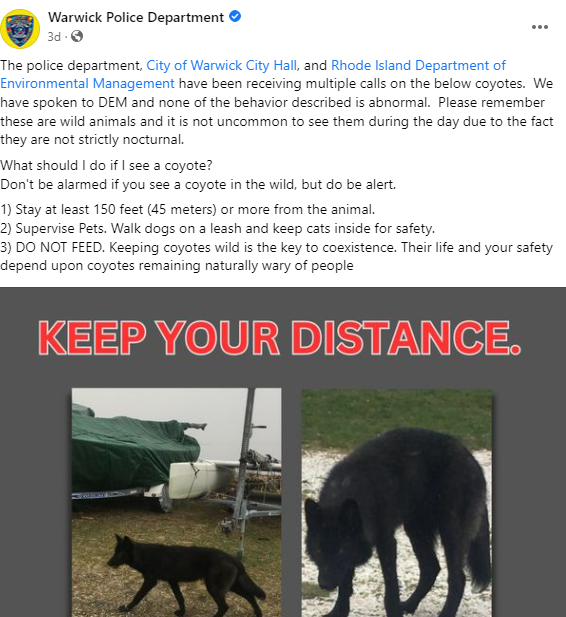 The drama started earlier in the week when police had been notified by a resident who stated having seen dark-colored “coyotes” running through the neighborhood. The Warwick Police Department posted a warning on their Facebook page: