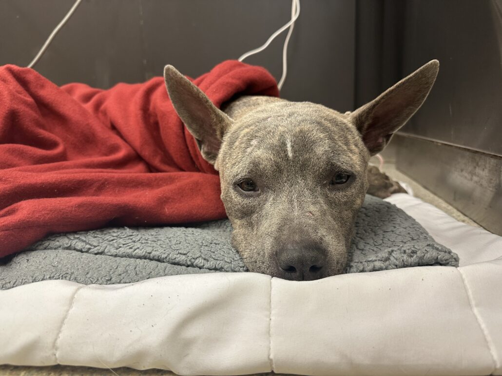 Good Morning from Panchita!! Yes, she made it through the night! Looks like we have a warrior girl on our hands! She just came back to Stray Rescue after going to an overnight ER. They took such wonderful care of her, and now she’s home. She even wagged her tail and wiggled her whole body which is unbelievable to us. After being in emergency surgery yesterday and having her heart stop 3 times…to eating breakfast and feeling so good already today! We got her set up on the comfiest of blankies and will monitor her all day.