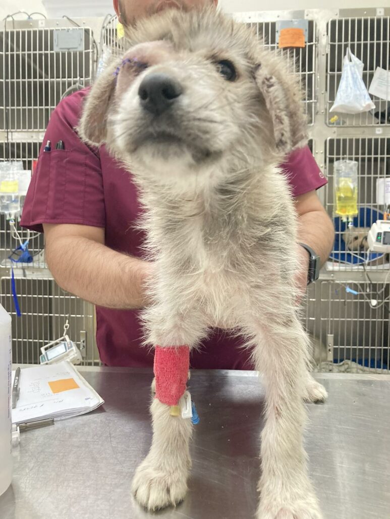 Because it was a Sunday, all local veterinarians were closed, and therefore had to be transported to the closest veterinary emergency hospital for immediate care for puppy’s eye – which as can be seen bulging from its socket. In addition, the puppy was bleeding from either his nose or another part of his face.