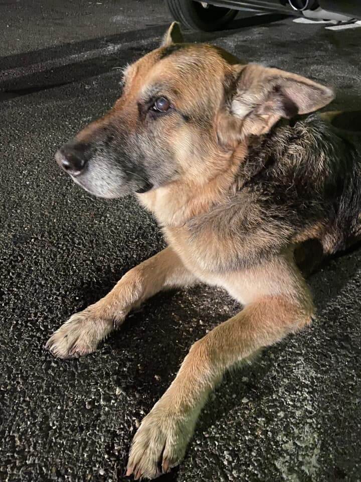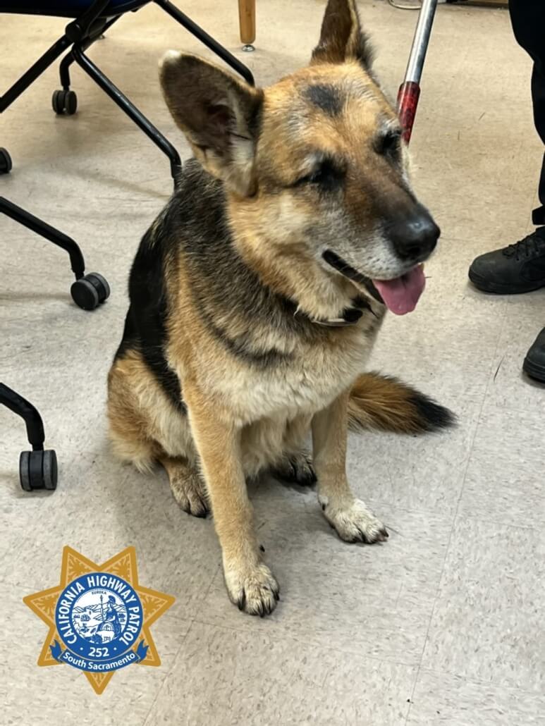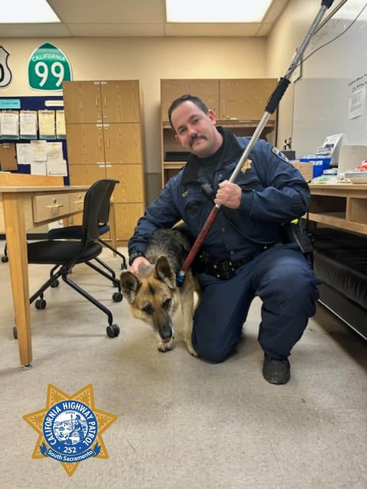 Officers Scott and Perez from the California Highway Patrol South Sacramento, spotted a German shepherd dog running along the busy thoroughfare of Stockton Boulevard on Saturday night.