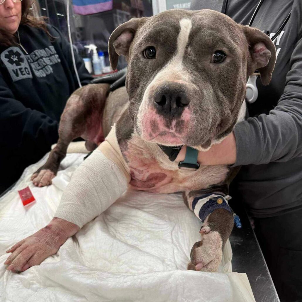This is Champ! He was pulled from a shelter after 11 days in January and brought to the Illinois based It’s a Pittie Rescue. His condition was critical. He had heartlessly been abandoned by his owner in the shelter parking lot; temperatures had dipped to -30, he suffered from wounds all over his body and had been wrapped in plastic wrap.