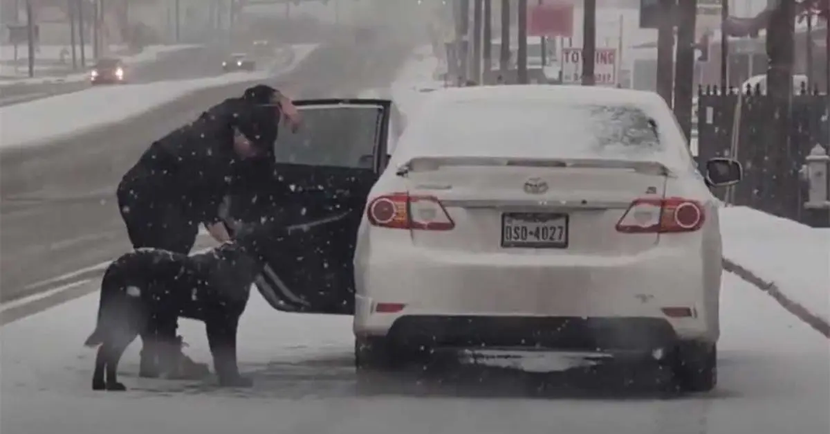 The rescuer, moved by empathy, pulled over to the side of the road and approached the frightened dog. With gentle reassurance, they coaxed the dog into their car, offering a lifeline from the perilous highway.